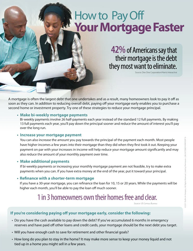 If you’re like many Americans with a mortgage, you’re probably looking for ways to pay it off sooner. You’re in luck! Below are some great tips to help you reduce your principal and eliminate your mortgage debt faster, so that you have more money in your bank account for retirement, investments or a relaxing tropical vacation. If you’re among the one-in-three lucky homeowners who have paid off their mortgage, forward this information on to family or friends who are seeking to pay off their mortgage debt.